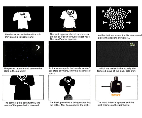 I devised and storyboarded this short film for Lacoste in order to bring to life the words warm and intense, which are associated with their L.12.12 Noir fragrance.