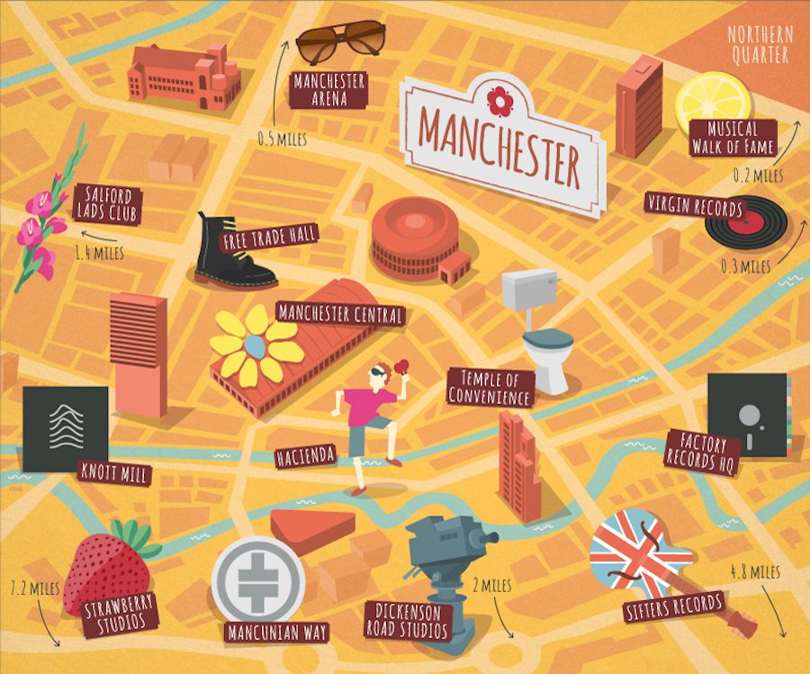 When viewed in situ, users can click on the map to reveal photos of the building depicted, and discover how each location links to a different Manchester band.